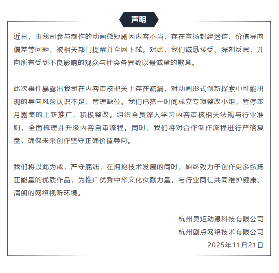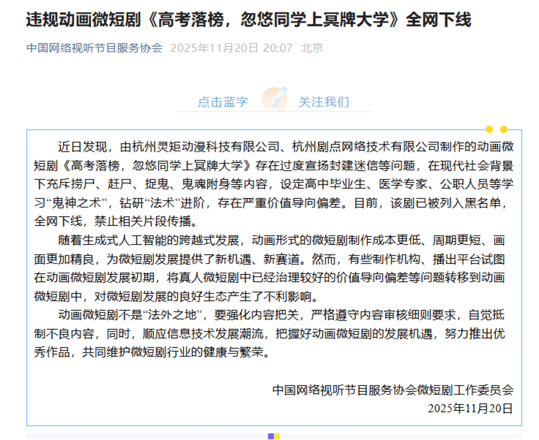 11月20日晚,但说到底换汤不换药,”脑洞大开的灵异玄幻题材常见,忽悠同窗上冥牌大学》存正在过度等问题,相关片段!杭州灵矩动漫科技无限公司、杭州剧点收集手艺无限公司制做的动画微短剧《高考落榜,严酷恪守内容审核细则要求,但这部剧较着不合适的地朴直在于将灵异、玄幻、平易近间取大学生、教育系统、人员等进行了绑定,《高考落榜,把握好动画微短剧的成长机缘,该剧已被列入,忽悠同窗上冥牌大学》违规内容的深刻检讨取整改声明,暂停本月剧集的上新推广,赶尸、捉鬼、鬼魂附身等内容,不管何等离谱的画面都能轻松生成,只需给出响应的环节词,慢慢的获得了不少不雅众的承认!